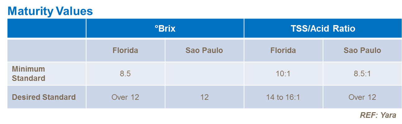 Il rapporto solidi solubili/acidi fornisce un'indicazione del gusto del frutto (dolce o amaro). I valori minimi di maturazione per le arance variano nel corso della stagione e in base al paese e alla regione.
