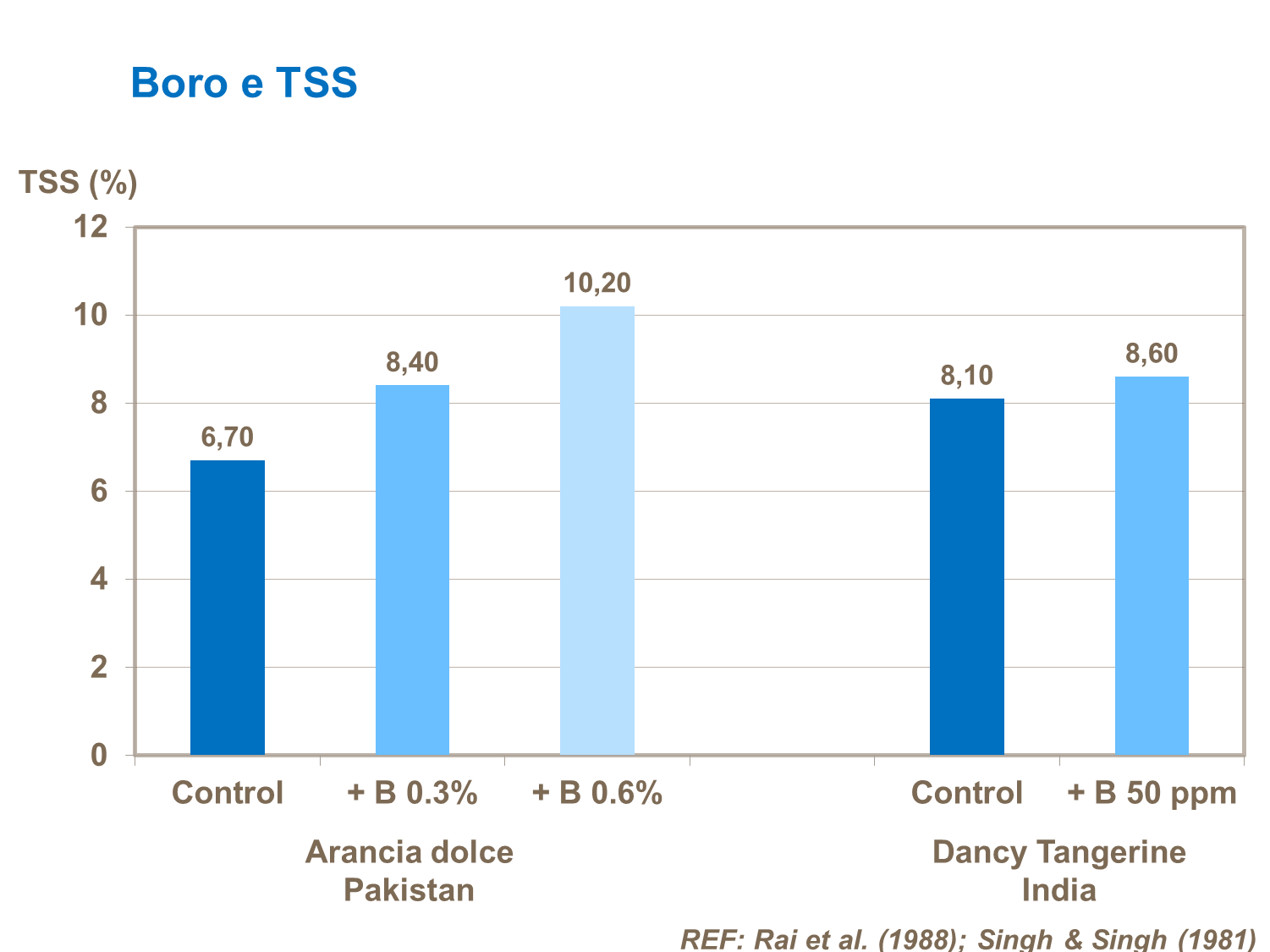 Il boro aumenta il livello di zuccheri presenti nei frutti. In questi studi, in particolare quelli realizzati sull'arancio dolce, a seguito di un'applicazione dello 0,6% si è constatato un aumento dei solidi solubili totali pari a quasi il 50%.