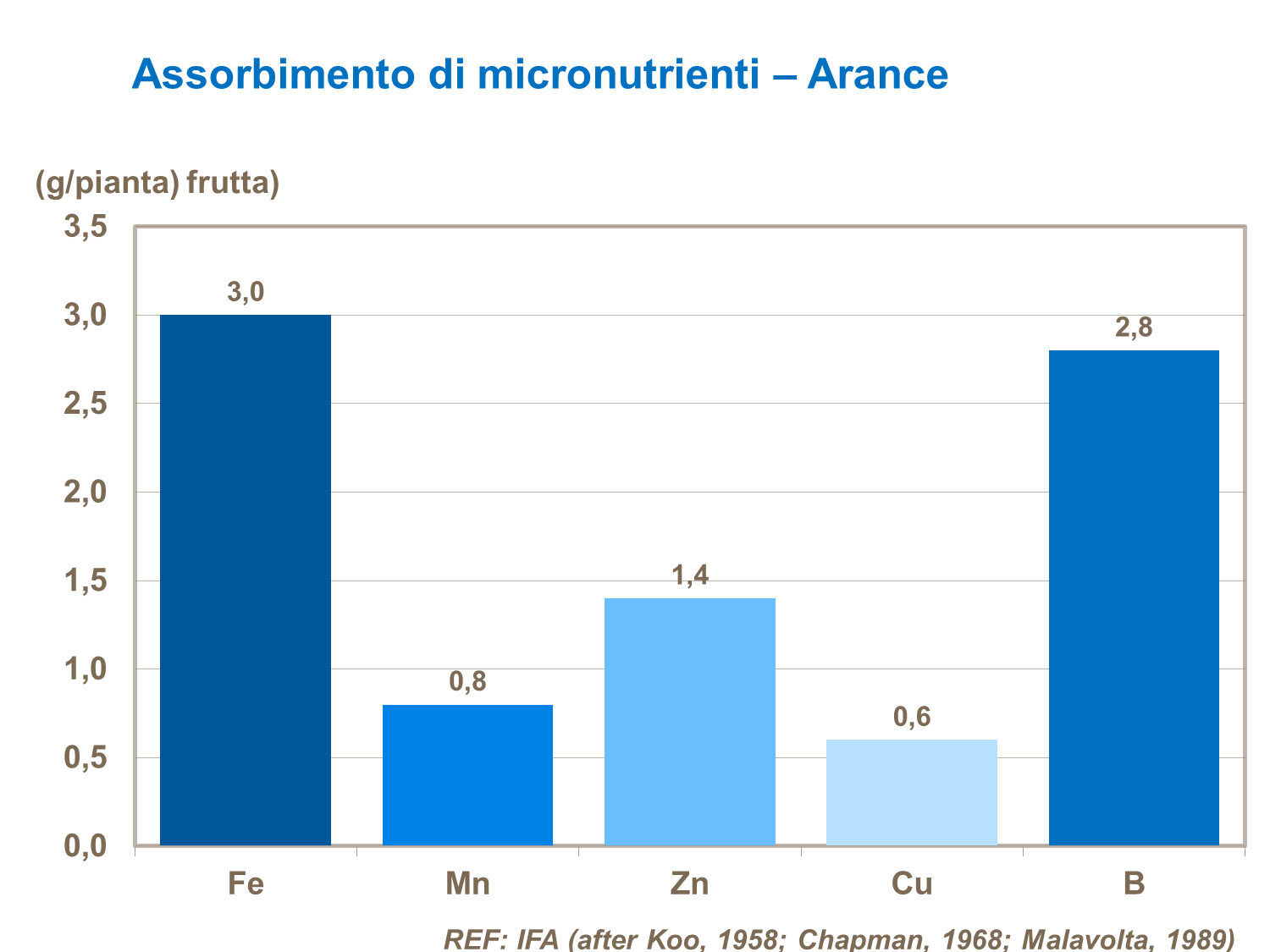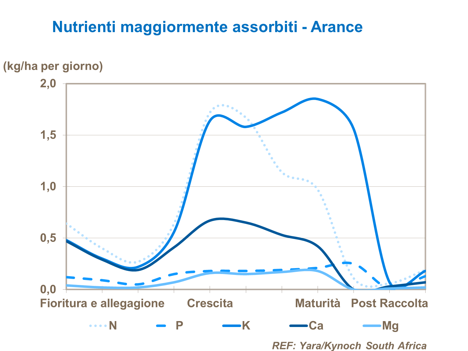 L'azoto e il potassio sono i nutrienti più importanti per aumentare la crescita degli agrumi e la resa delle colture. Durante la fase di crescita dei frutti sono necessari fino a 2 kg/ha di azoto al giorno e durante la maturazione devono essere disponibili quantità simili di potassio.
