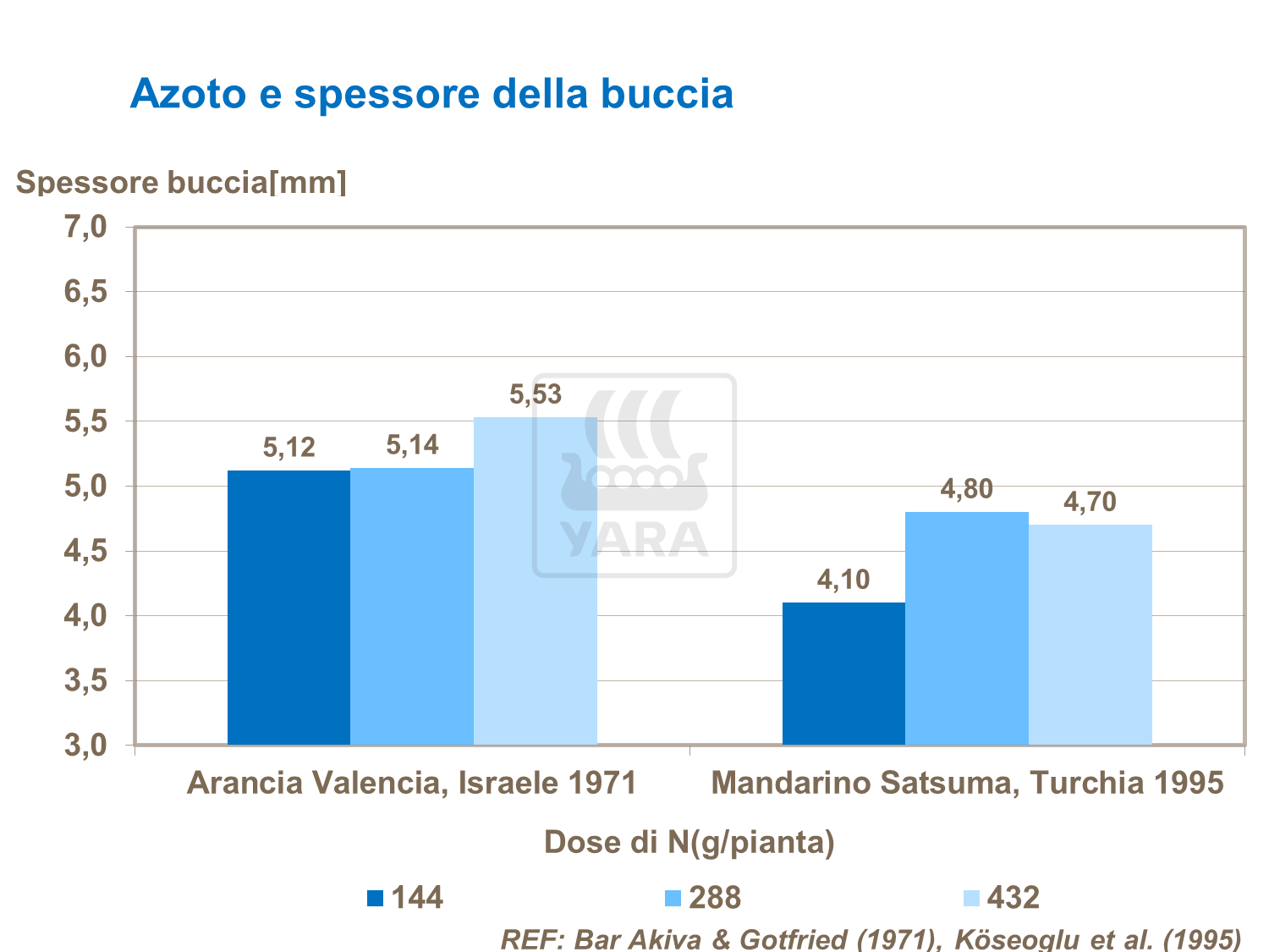 Le colture con adeguati livelli di Azoto presentano una buccia più spessa e dunque un rischio ridotto di danni meccanici e incidenza di malattie. Troppo Azoto può portare a una buccia troppo spessa, riducendo il contenuto di succo e la taglia dei frutti.