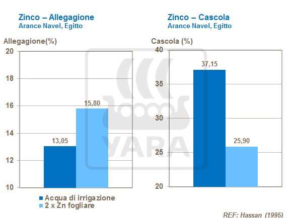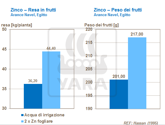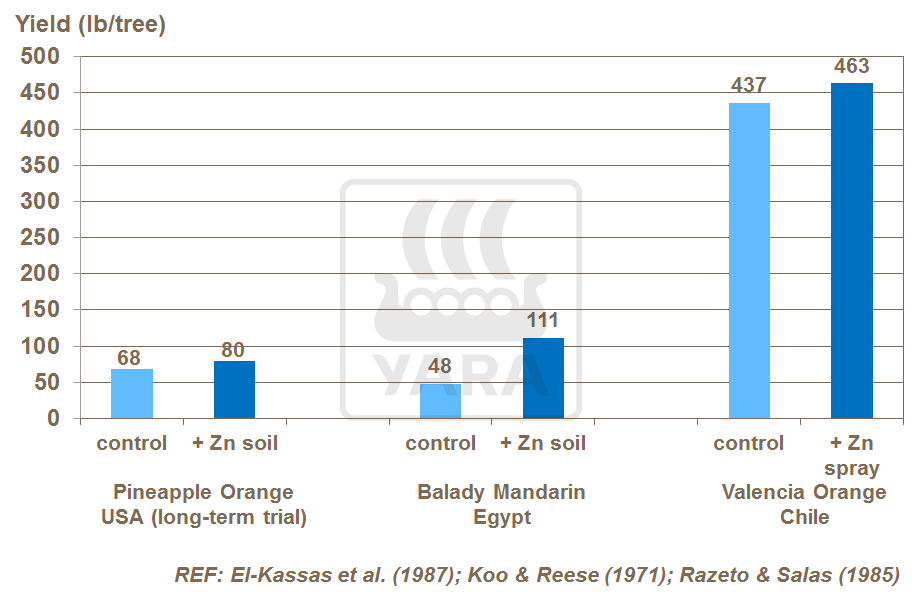 La carenza di Zinco riduce la crescita vegetativa e dunque il potenziale di resa. Bassi livelli di Zinco riducono il numero dei frutti per pianta, come mostrano le prove in Egitto sulle arance Navel.