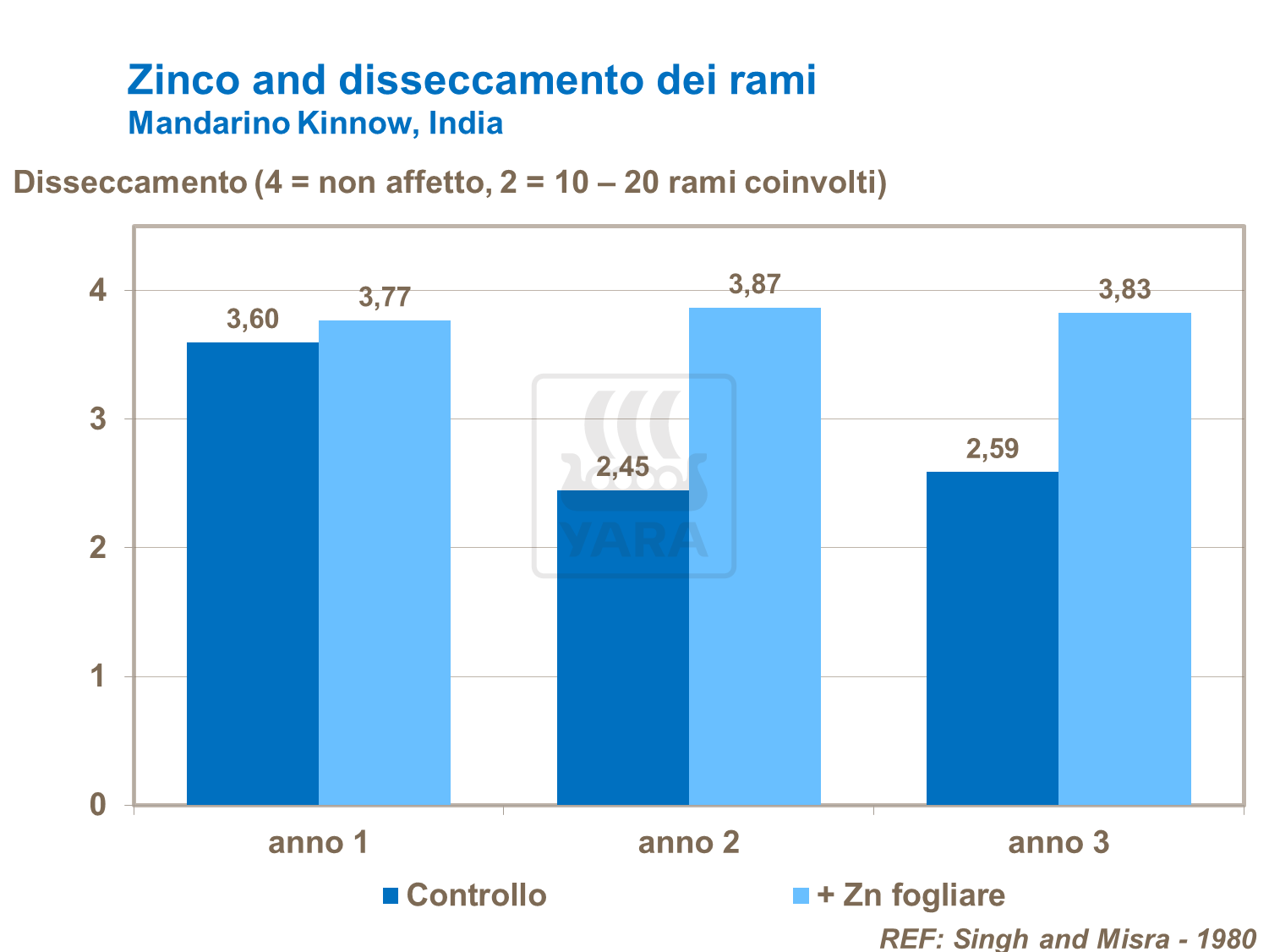 I sintomi di carenza appaiono dapprima come punti clorotici sulla foglia (foglie chiazzate) e/o con aree intervenature che diventano bianche con le venature che restano verdi. Le nuove foglie sono visibilmente pallide e spesso si dispongono a rosetta in quanto gli internodi dei rami si accorciano significativamente. Il disseccamento può essere evitato usato Zinco fogliare, come mostra il grafico.