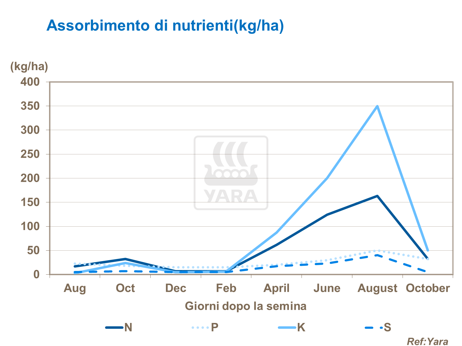 Non appena le piante iniziano a crescere in primavera (6-7 mesi dopo la semina), la richiesta giornaliera di nutrienti accelera di pari passo con lo sviluppo della biomassa. Le richieste di azoto, fosforo, potassio e zolfo saranno tutte alte e quindi sarà necessario eseguire applicazioni multiple di nutrienti in adempimento alla domanda. Questa crescita e sviluppo rapidi richiedono anche livelli di assorbimento più elevati di micronutrienti. Carenze transitorie possono verificarsi e devono essere affrontate con micronutrienti fogliari (prodotti YaraVita). Il manganese, lo zinco, il rame e il magnesio dovrebbero essere gestiti per tutto questo periodo di crescita.