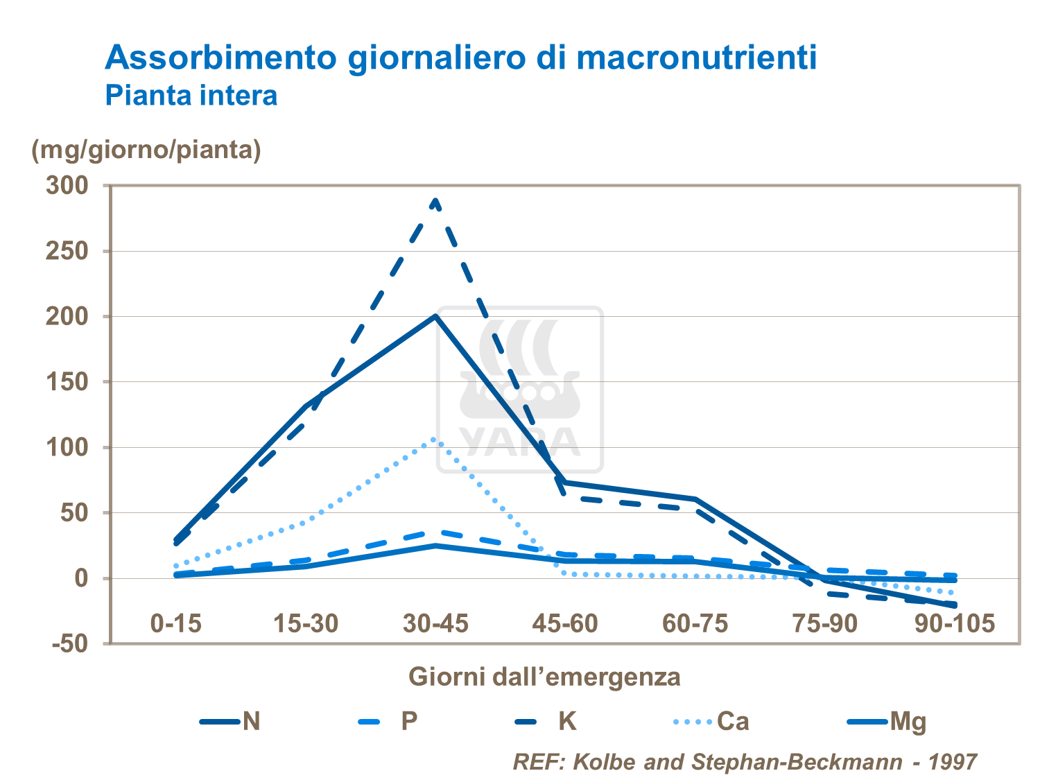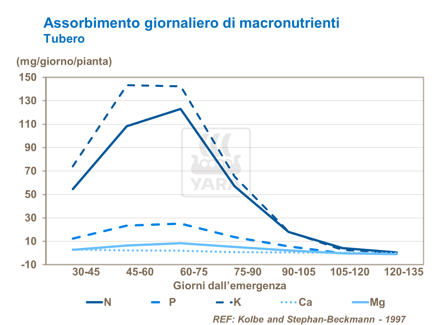 L'assorbimento dei nutrienti varia a seconda dello stadio di crescita della coltura. Durante la prima fase di crescita primaverile il fabbisogno di macronutrienti è elevato e per evitare un calo delle rese è necessario che le sostanze nutritive siano disponibili in quantità sufficienti, affinché la pianta le possa assorbire quando ne ha bisogno. Sia il potassio che l'azoto sono necessari durante tutto il ciclo di crescita vegetativa, formazione del tubero e ingrossamento.