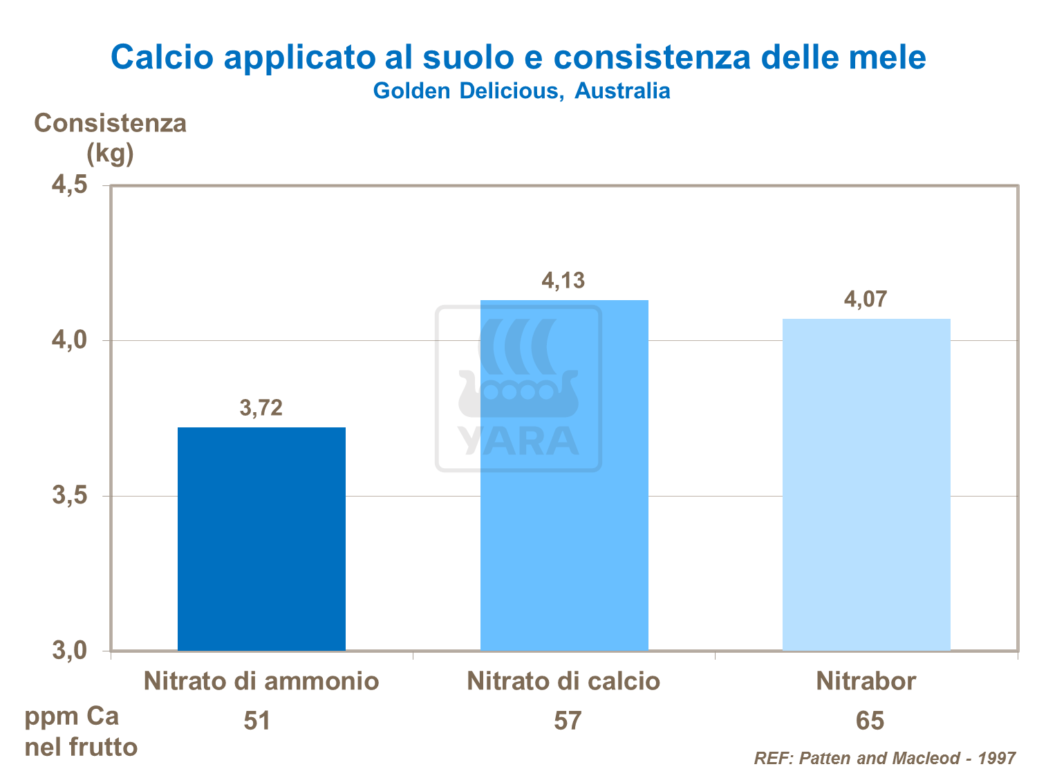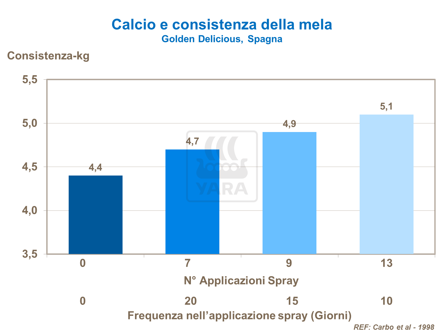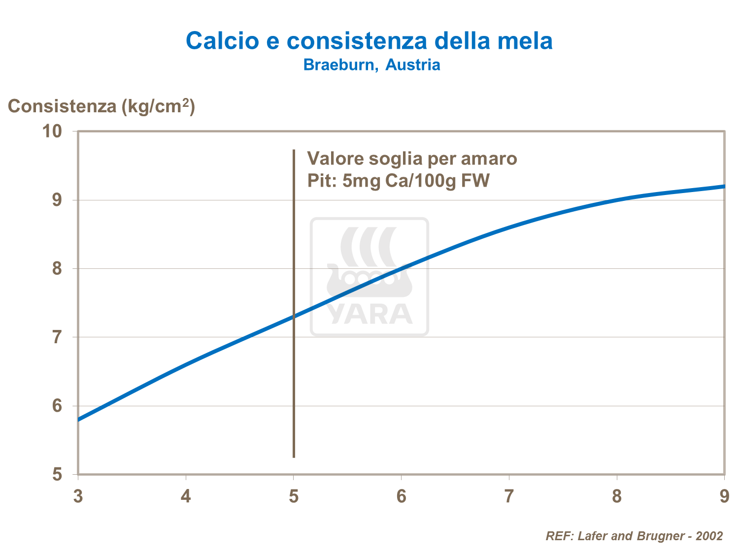 Le sperimentazioni indicano che, ai fini della durezza, il valore consigliato di Calcio nei frutti delle pomacee al momento della raccolta deve essere superiore a 5 mg/100 g di peso di frutti freschi per ridurre l'incidenza della butteratura amara.