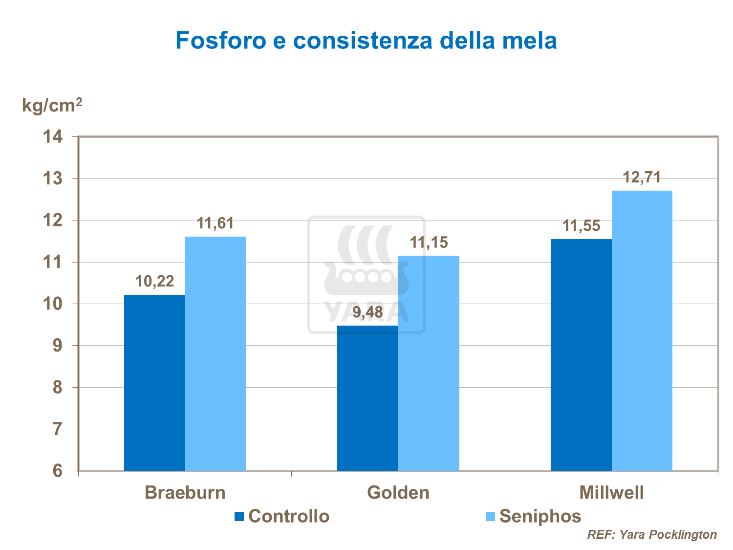 Le applicazioni fogliari di Fosforo effettuate sei settimane dopo la caduta dei petali sono utili per aumentare la durezza dei frutti e migliorano anche la conservabilità a lungo termine.