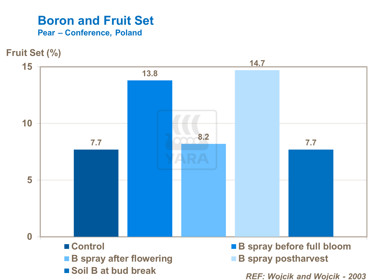 Poiché il trasporto del Boro non è immediato all'interno dell'albero, si utilizza principalmente per via fogliare nei periodi fondamentali della fioritura e della formazione dei frutti, in modo da favorire l'allegagione dei fiori.