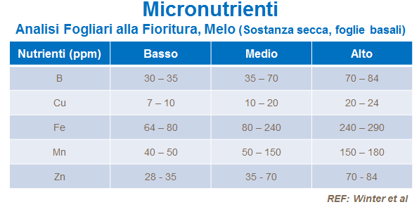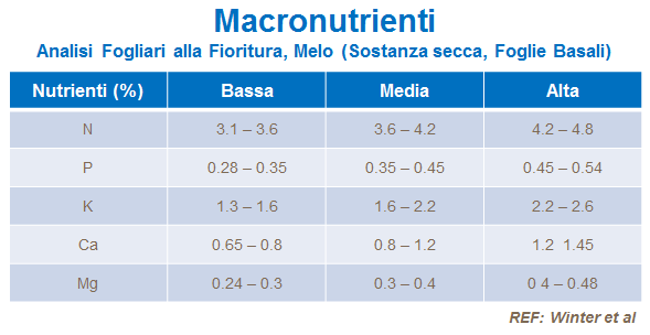 Nonostante le tabelle riportino valori considerati efficaci per una crescita ottimale, non considerano la capacità dell'albero di riciclare i nutrienti per i frutti. Ad esempio, anche se i livelli tissutali di Ca sono sufficienti, il frutto potrebbe esserne carente e avere problemi qualitativi durante la conservazione. Per prevenire possibili squilibri dei nutrienti che potrebbero causare problemi in fase di conservazione si utilizza con sempre maggiore frequenza l'analisi dei frutticini di circa 25-30 mm di diametro. Questa analisi consente di effettuare somministrazioni mirate a frutti e foglie.
