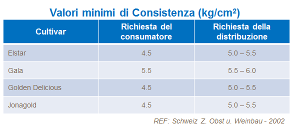 Sono stati stabiliti standard minimi di durezza per le diverse cultivar. Se più di una delle percentuali prestabilite è al di sotto dello standard di durezza, è possibile che le partite di frutta destinate all'esportazione vengano respinte.