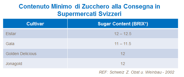 All'aumentare del grado zuccherino il frutto risulta più dolce e strutturato. Gli zuccheri sono i principali solidi solubili dei succhi della frutta e, per questa ragione, spesso si utilizza il livello di solidi solubili per stimare il grado zuccherino. Il tenore di zuccheri tipico di mele e pere mature è di circa 12 e 10 °Brix rispettivamente. I commercianti stabiliscono il tenore minimo di zuccheri in base alle cultivar al momento della consegna.