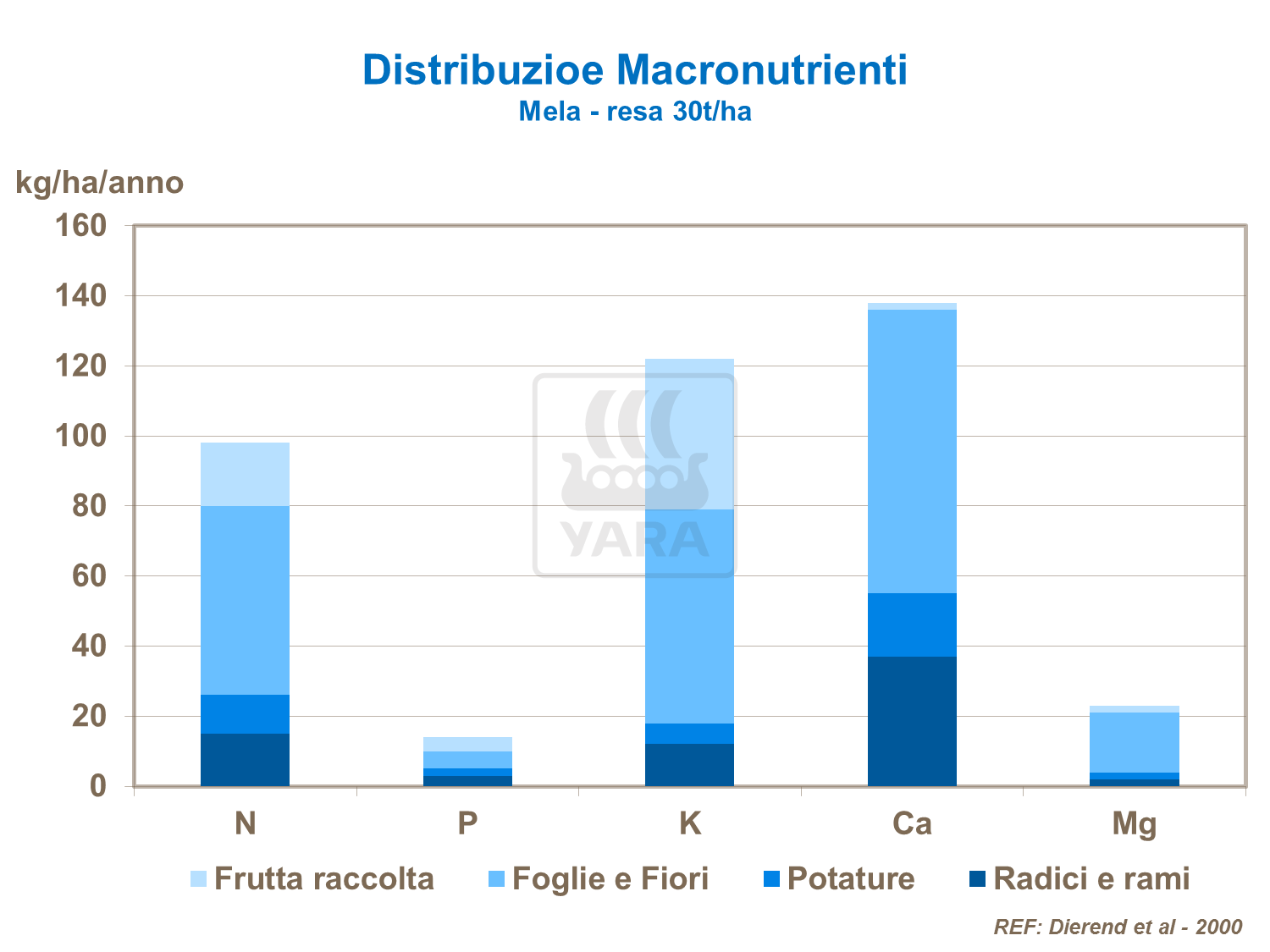 Calcio, potassio e azoto sono i macronutrienti più importanti per i frutteti di valore economico. L'albero necessita di grandi quantità di calcio per crescere e mantenersi sano. Anche se solo una piccola quantità di calcio raggiunge il frutto, questa bassa concentrazione è essenziale e importante per ridurre i problemi qualitativi durante la conservazione.