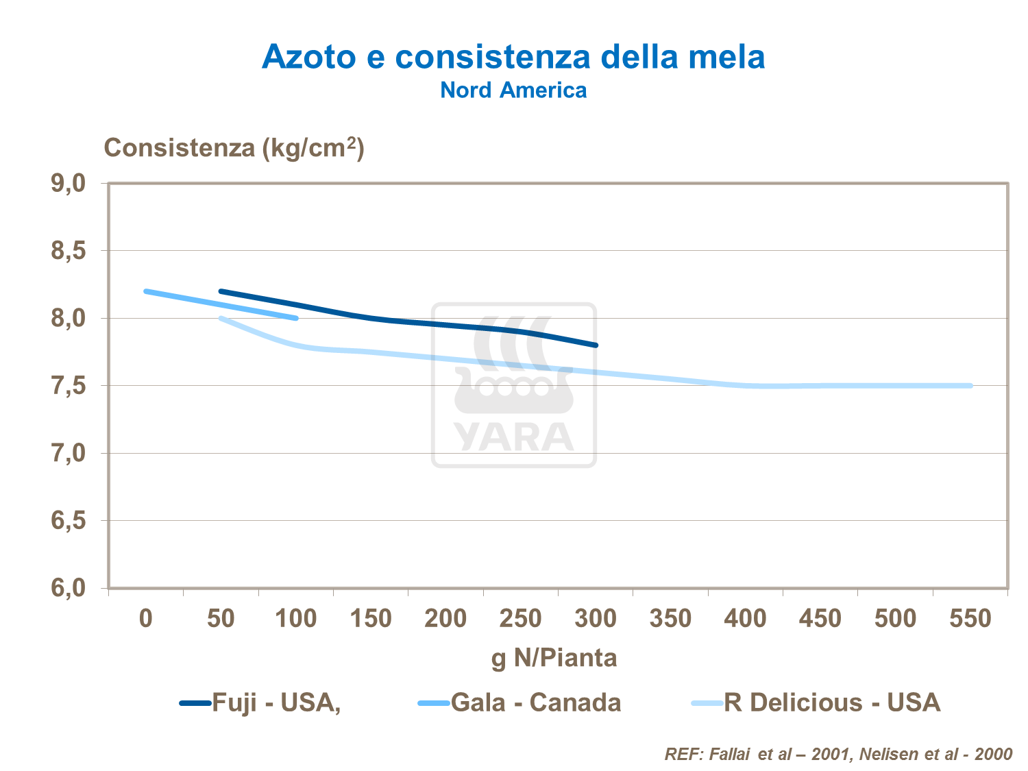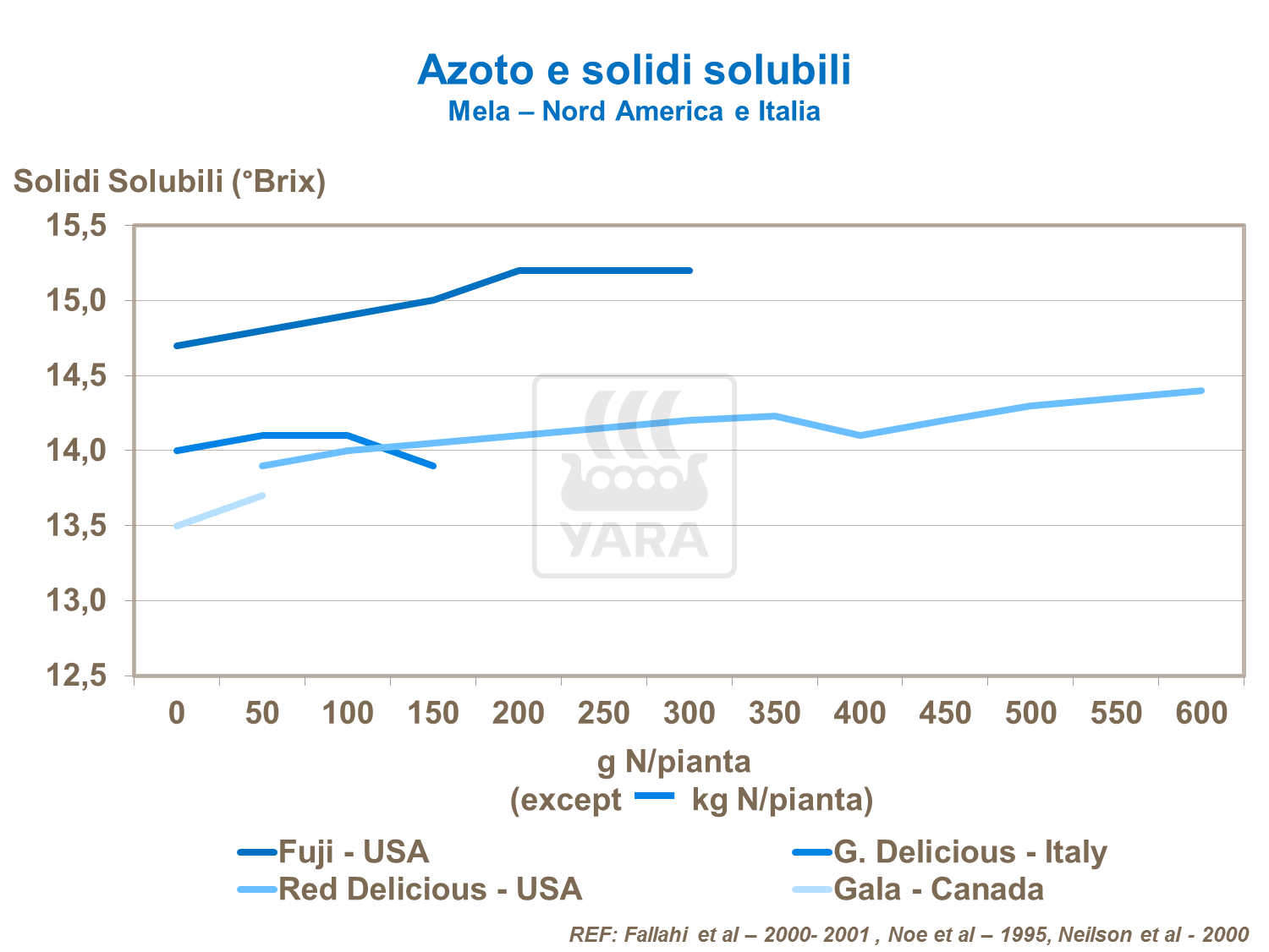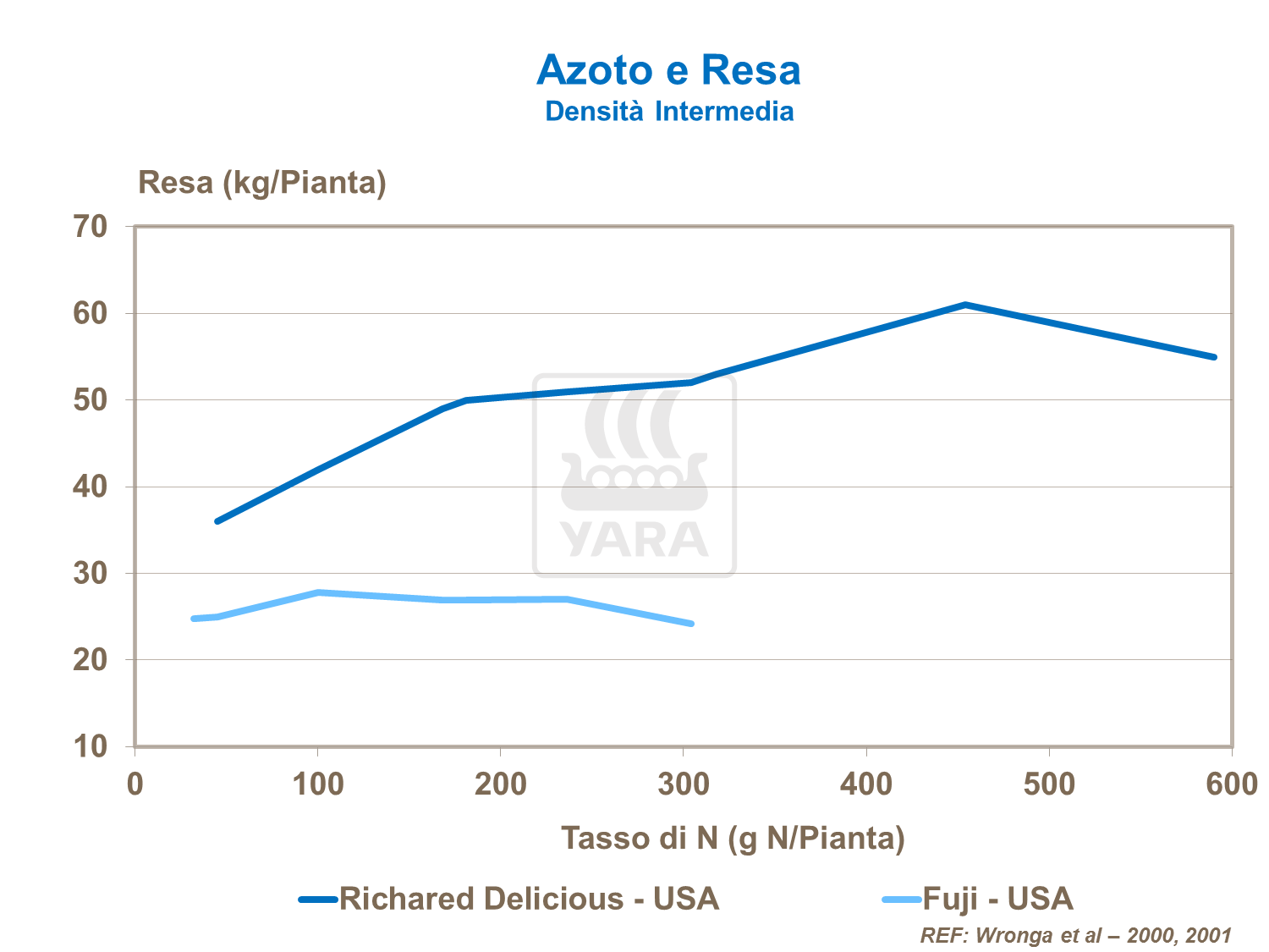 Le ricerche hanno riportato variazioni di livelli di Azoto considerevoli nelle diverse piante. Il risultato dell'applicazione di un fertilizzante dipende dallo stato di fertilità del suolo, dal livello di riserve di azoto nella pianta e dal sesto di impianto del frutteto. La figura riporta l'effetto sulla resa di frutteti a moderata densità di impianto negli USA