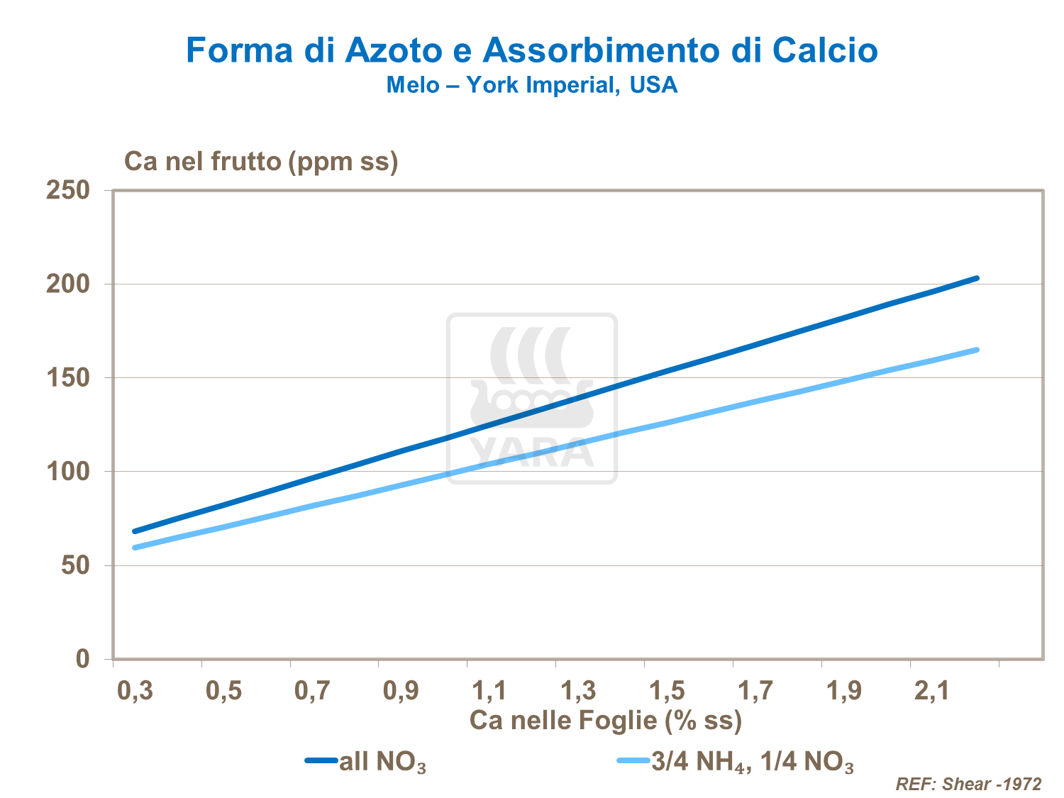 Studi con mele York Imperial negli USA mostrano come la forma di Azoto incida sull'assorbimento di Calcio, dal momento che il Nitrato di Calcio incrementa il miglior assorbimento del calcio rispetto al nitrato di ammonio. Senza sufficiente Calcio la qualità del frutto diminuisce notevolmente.