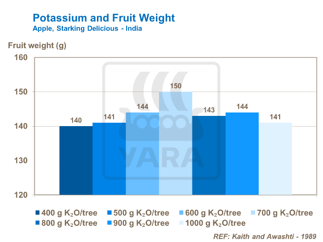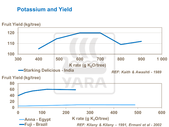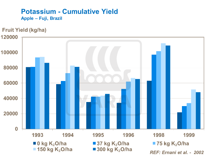 Applications need to be adjusted according to soil potassium levels. Where levels are high, high fertilizer rates may lead to a yield reduction, as trials with Fuji apples in Brazil show.
