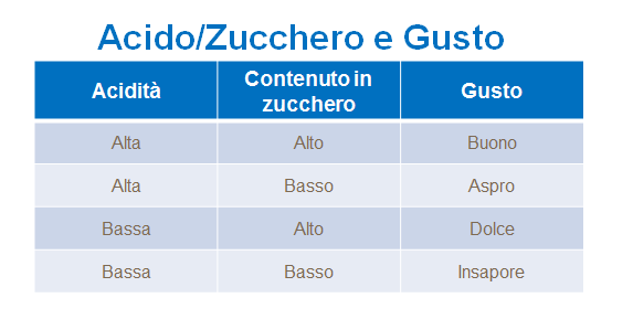 Alcuni paesi hanno stabilito indicatori quantificabili del sapore di un frutto. Per esempio, in Francia, il sapore è valutato prendendo in esame l'equilibrio tra zucchero e acidità titolabile totale. I francesi preferiscono un rapporto di zucchero/acidi pari a 10 e un contenuto di acidi pari a 5 g di acido citrico idratato/l.