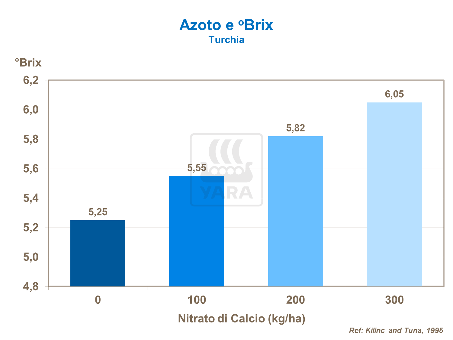 Alti livelli di Azoto nitrico applicato come nitrato di Calcio aumentano i livelli di solidi solubili totali TSS come rilevato con l'indice Brix.