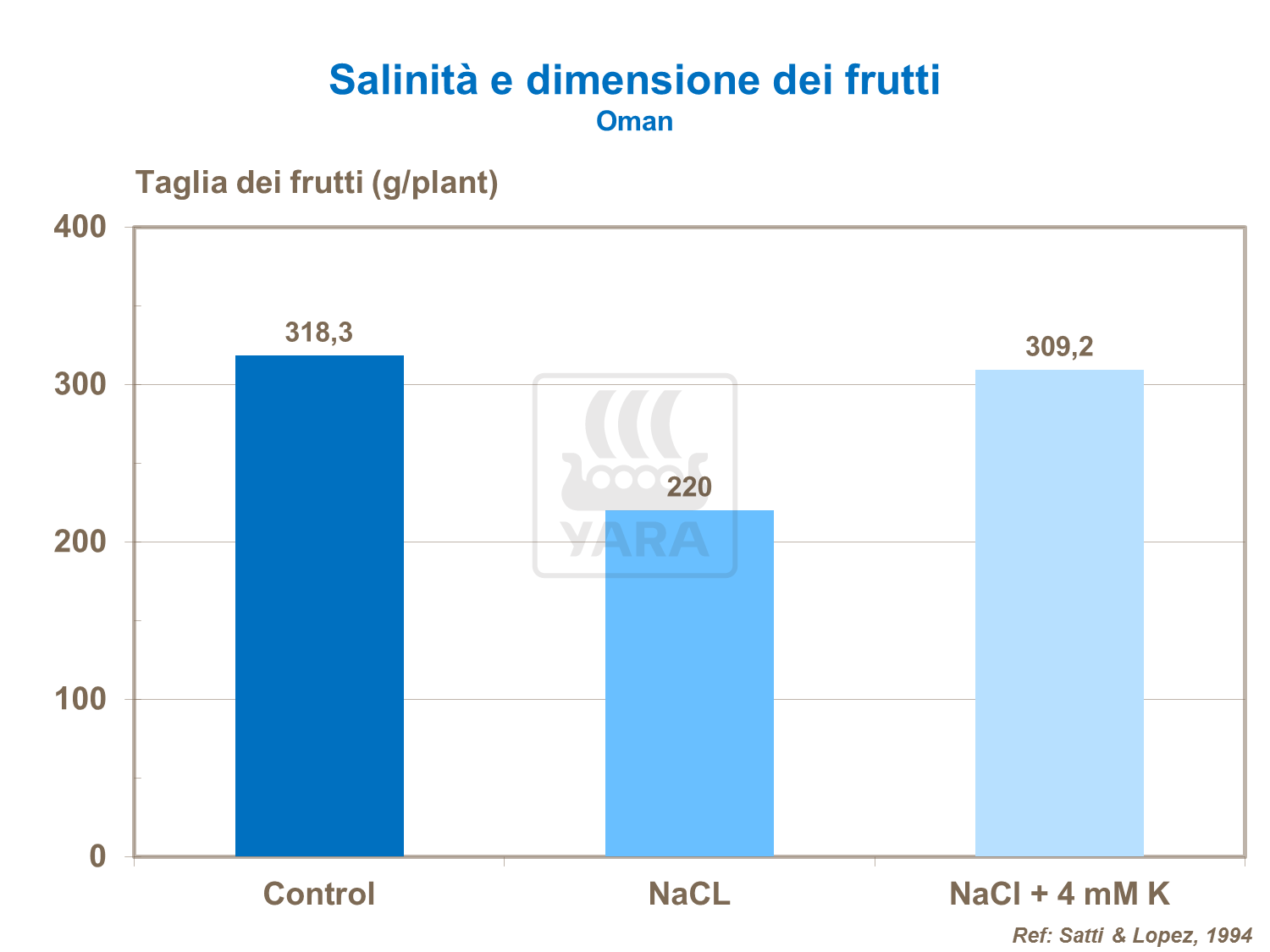 - Riduce la dimensione dei frutti (cfr. grafico sulla salinità e la grandezza dei frutti). L'aggiunta di potassio risolve questo problema.
